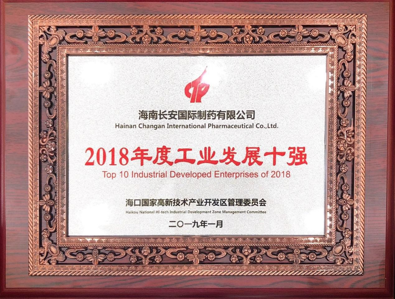 海南長安國際制藥有限公司榮獲“2018年工業發展十強”“2018年發展潛力之星”