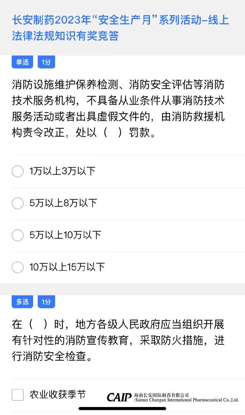 為了進一步提高長安制藥全體員工參與學法用法的積極性和主動性,長安制藥在安全生產月期間,開展了長安制藥2023年”安全生產月“系列活動——線上法律法規知識有獎競答,讓員工在競答中學習掌握法規知識。